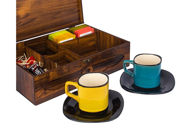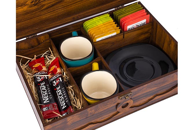 نام محصول: جعبه پذیرایی (ست دمنوش) شناسه محصول: F201 محتویات داخل ست: دو عدد زیر لیوانی چوبی دو عدد فنجان و نعلبکی 20 عدد دمنوش Heath&Heather (قابل افزایش) دو عدد شکلات یا نسکافه همراه با ساک سوزنی