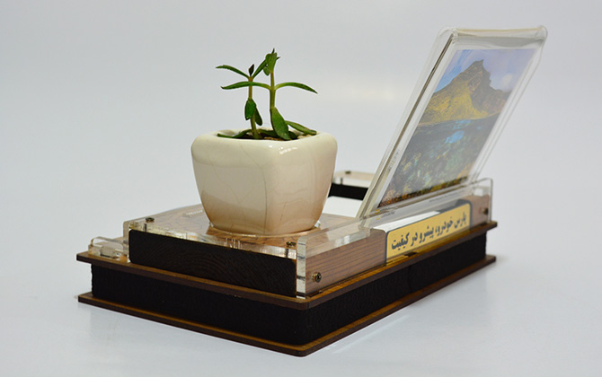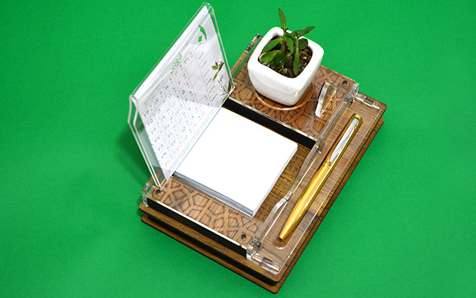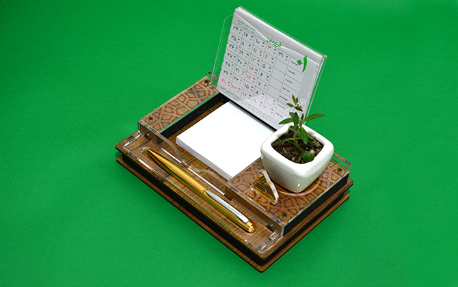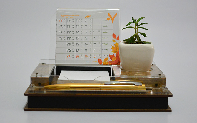 دارای گلدان (قابل ارائه با گل طبیعی و مصنوعی) فضای مخصوص برگه یادداشت بسته بندی چوبی جا خودکاری باکس زیر تقویم و یا قاب عکس فضای مناسب جهت تبلیغات اختصاصی شما