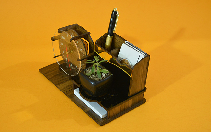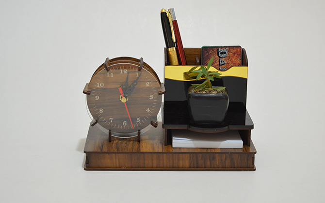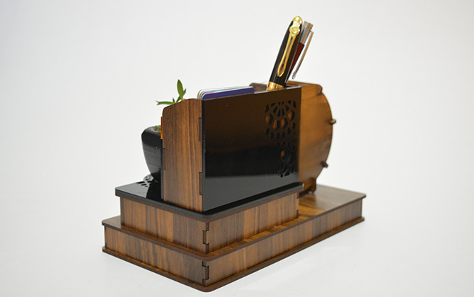 دارای گلدان (قابل ارائه با گل طبیعی و مصنوعی) فضای مخصوص برگه یادداشت جا کارتی جا خودکاری ساعت رومیزی باکس زیر بسته بندی چوبی فضای مناسب جهت تبلیغات اختصاصی شما