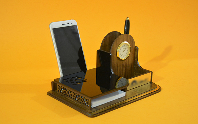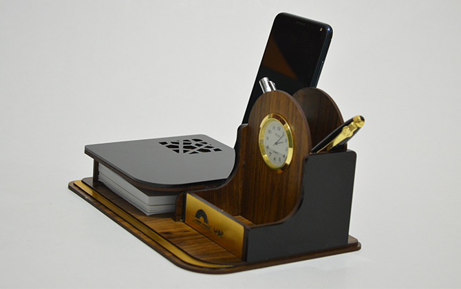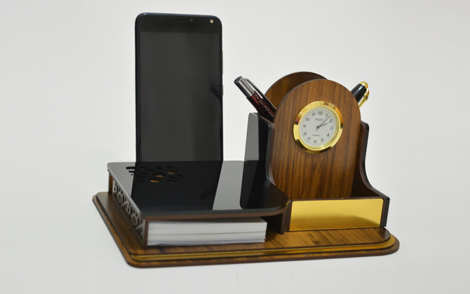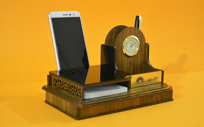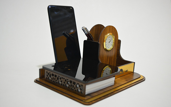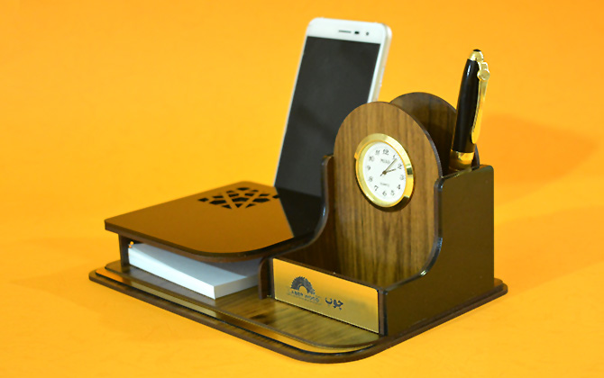 فضای مخصوص برگه یادداشت جا کارتی جا خودکاری ساعت کلاسیک باکس زیر نگهدارنده موبایل بسته بندی چوبی فضای مناسب جهت تبلیغات اختصاصی شما