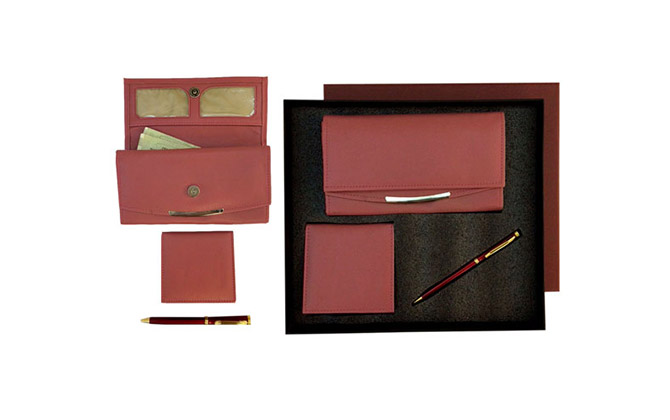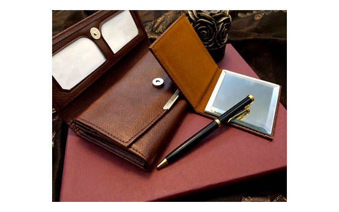 توضیحات کالاست کیف زنانه ، آینه (طرح چرم) و خودکار فلزی